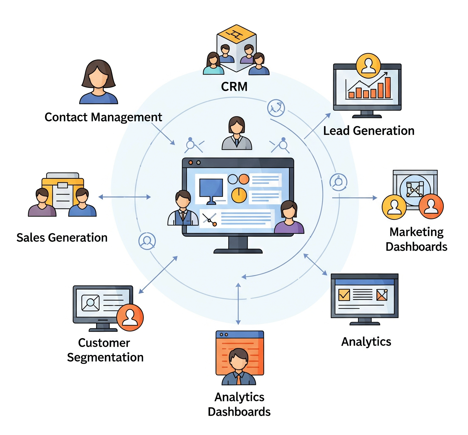 • Zoho CRM: Manage leads, accounts, contacts, deals, and sales pipelines with a 360-degree customer view.